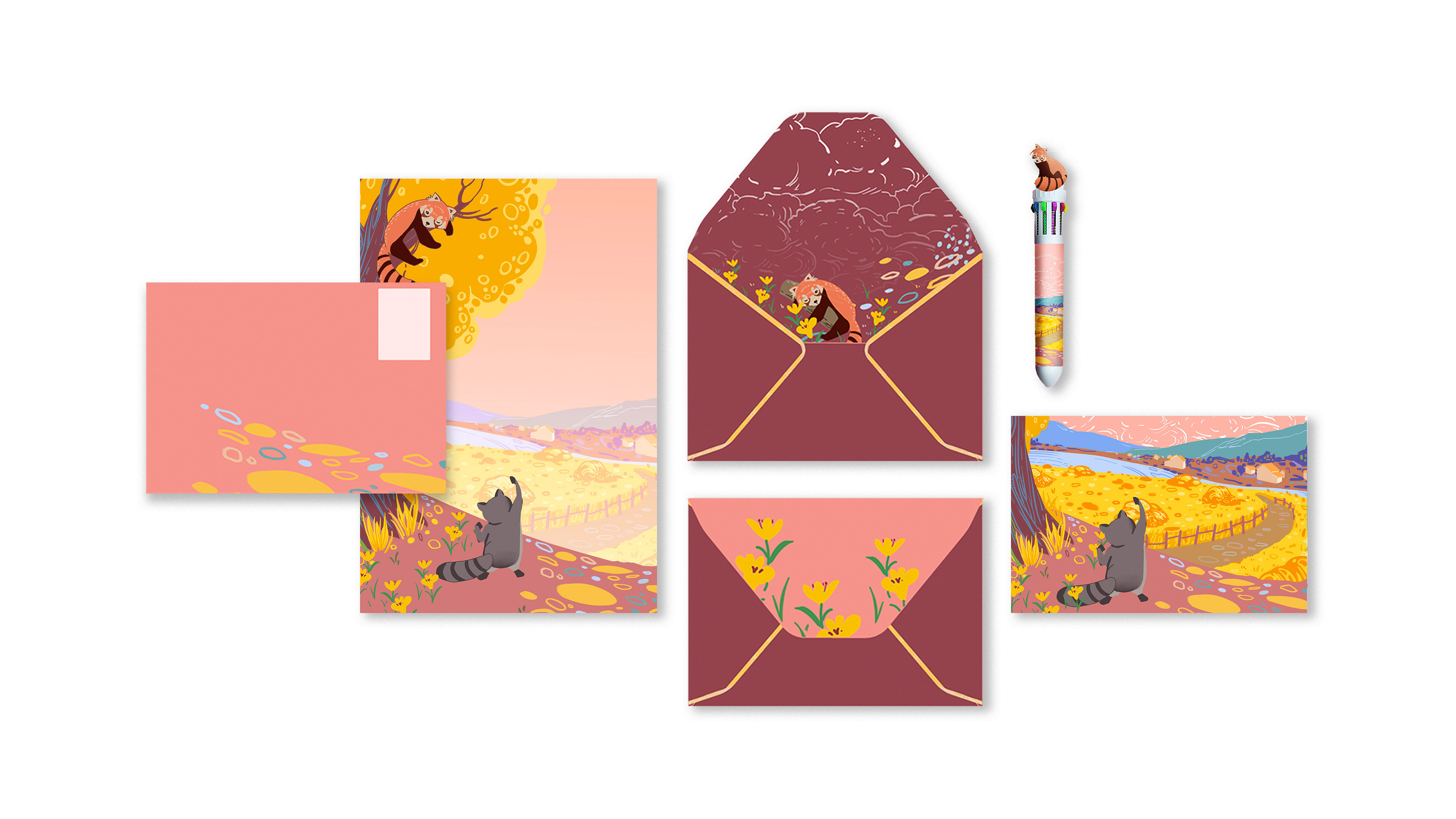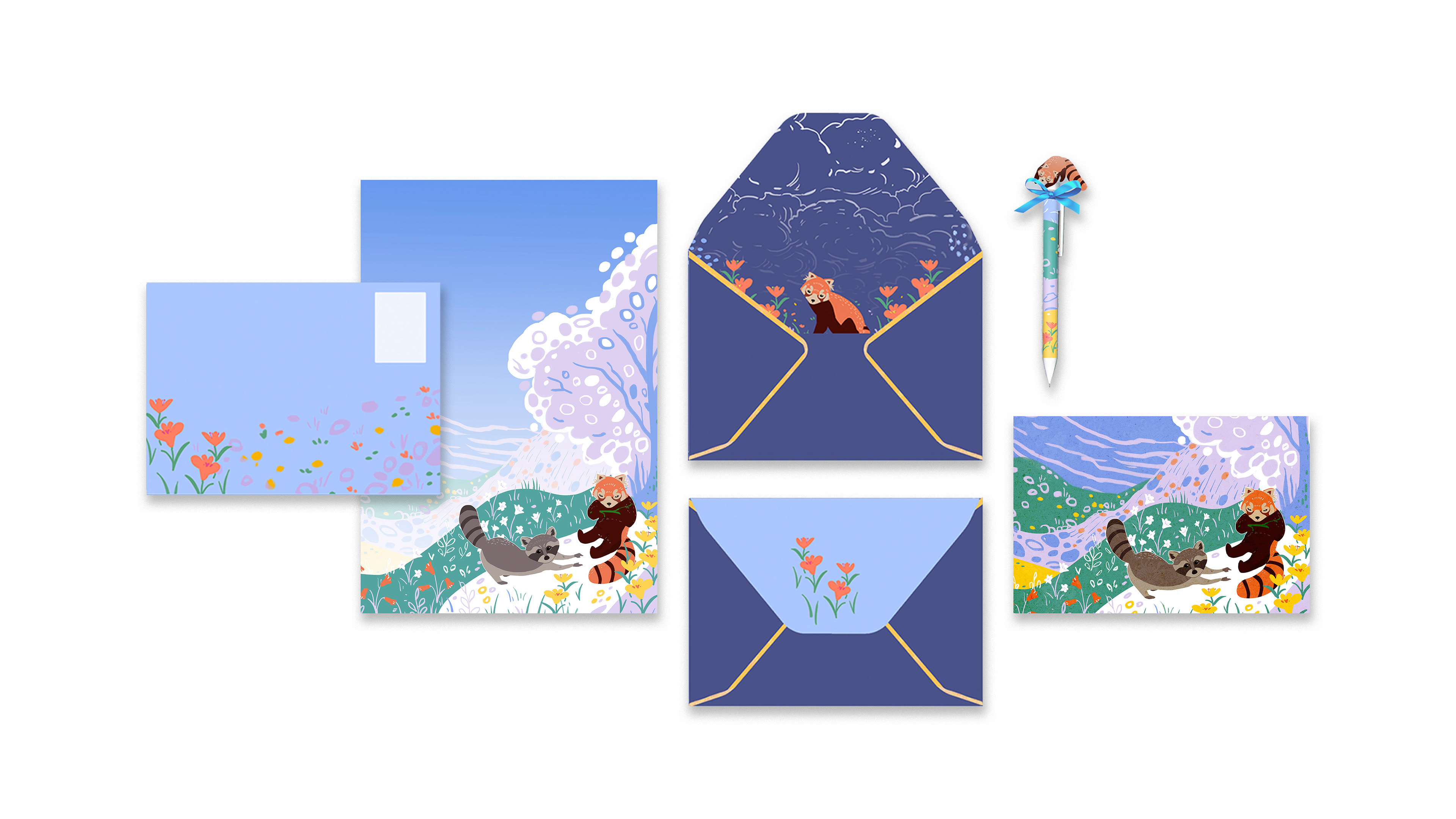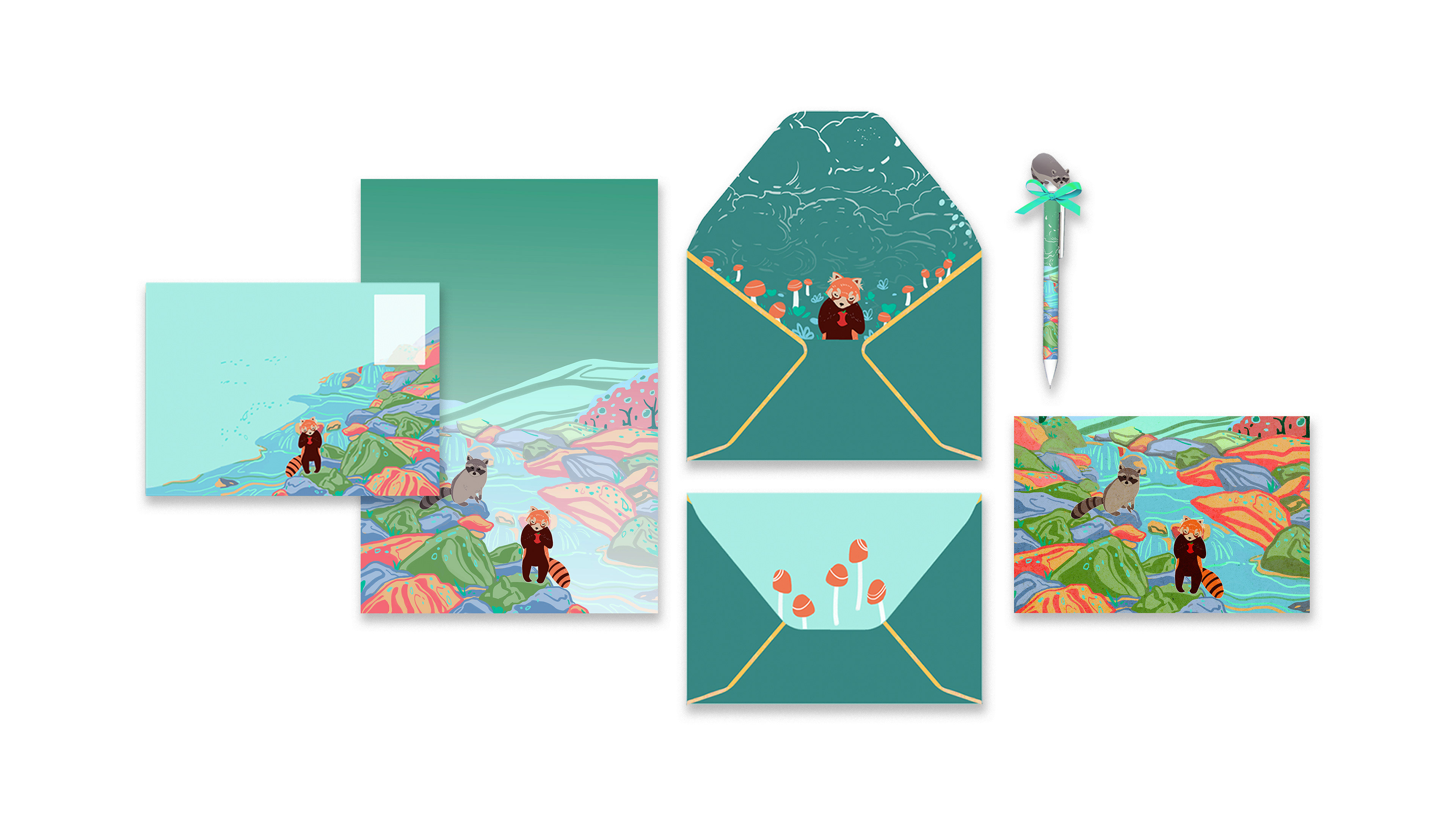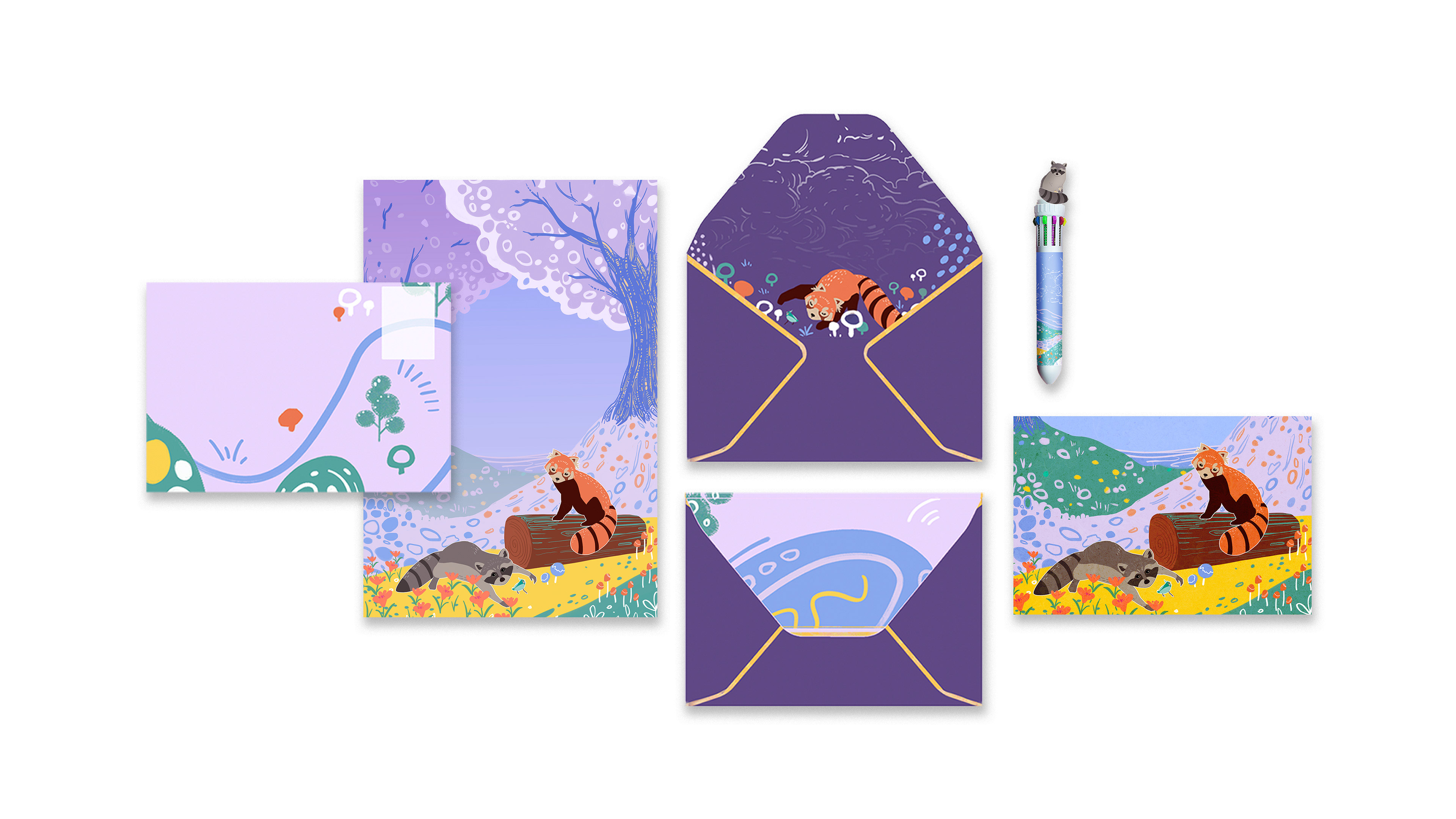 This stationery kit is inspired by the gentle friendship between a raccoon and a red panda — two curious travelers who share stories through letters. Designed for people aged 12 to 27, the collection includes letter paper, envelopes, postcards, pens, stickers, bookmarks, and tape, which could be mass-produced.